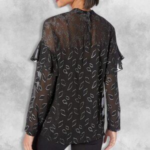 BCBG Sheer Top Blouse Cold Shoulder Metallic Chiffon Leaf Mock Neck Black W XS
