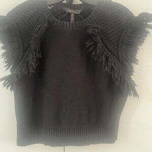 Sleeveless sweater with fringes. Excellent condition (Like New). 84% Cotton, 12% Acrylic, 3% Wool, 1% Alpaca. Fringes in the front and back. Worn Once.