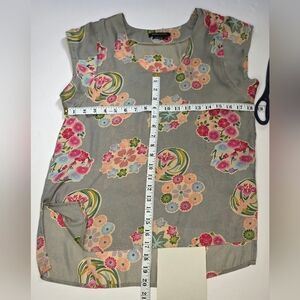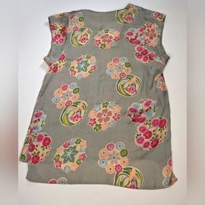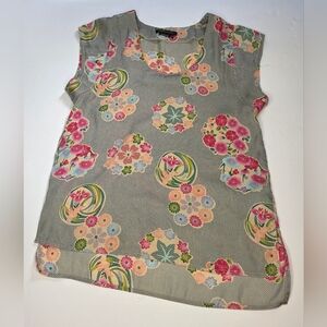 Sleeveless floral print top with round neck, cap sleeves, split sides and extended back.