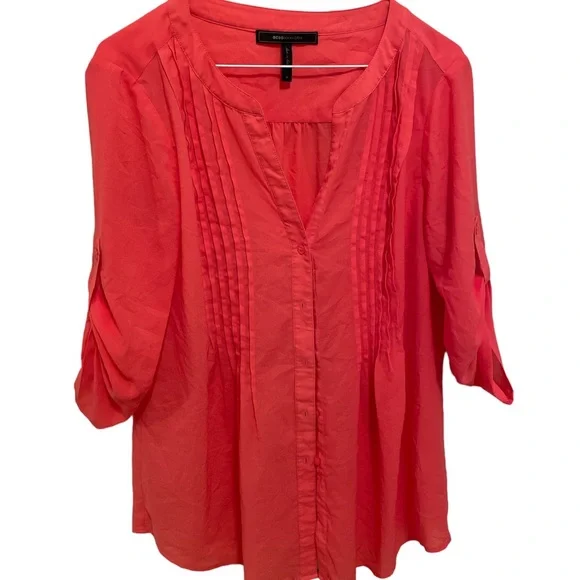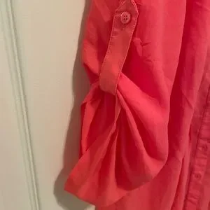 EUC. Lovely silky/flowy fabric, universal coral colour, front pleats and button up top. Wear sleeves up or down.