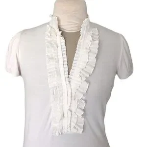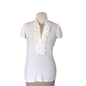 This is a white puff sleeve top by BCBG Max Azria. It's made from a soft stretch jersey fabric and has a poplin pleatead tuxedo trim front.