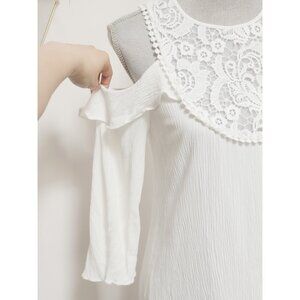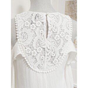 Breezy white crepe summer sundress with a fancy sheer crochet bib neck detail and keyhole back. Long sleeves with ruffles at the exposed shoulder. Hits above the knee. Made in China, 100% polyester