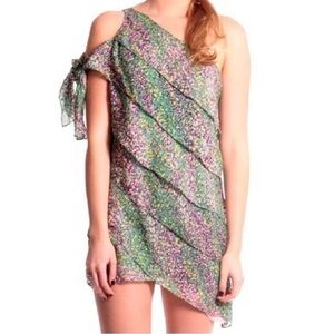 BCBGMaxAzria Runway Tiered Layered Ruffle One Shoulder Mini Dress Tie Sleeve
