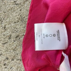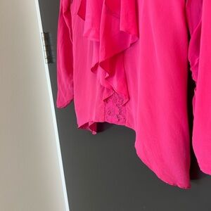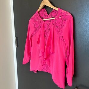 BCBC XS silk blouse GUC This elegant pink top features delicate lace detailing, perfect for adding a touch of sophistication to your wardrobe. Ideal for both casual and formal occasions.