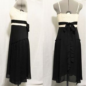 • Eyelet bodice. Pleated panels at skirt sides. Grosgrain ribbon tie. Side zipper close. Adjustable shoulder straps. Fully lined.