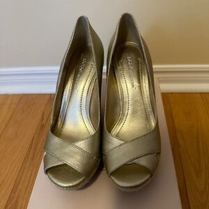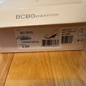 BCBG gold canvas wedge sandals Size 6.5 Comes with original box