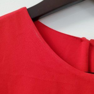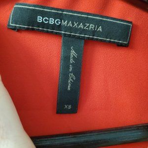BCBG bright raspberry (Not quite red, not quite pink.) blouse. Short in the front and long in the back, covers bum. Love it but it's just too small for my chest. Best for under a D cup! Very little wear underarm, but a slight makeup mark around neckline which may be able to wash out. (see photos) Fabric tag cut out but it is some kind of synthetic.