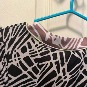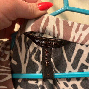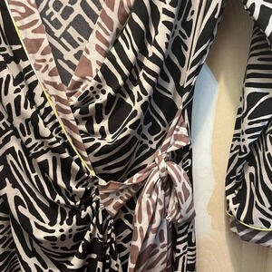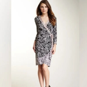 BCBG maxazria black white tan abstract patterned wrap dress long sleeve sm