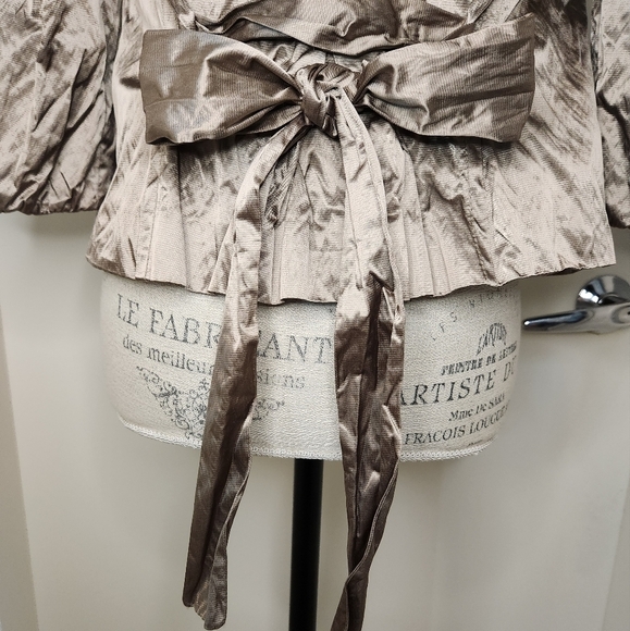 Satiny crinkle metallic bronze gold wide collar half sleeve crop blazer jacket with side pockets, by BCBG MaxAzria.