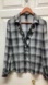 BCBG silk plaid long silk blouse, ruffle front, french cuffs, black, grey, L