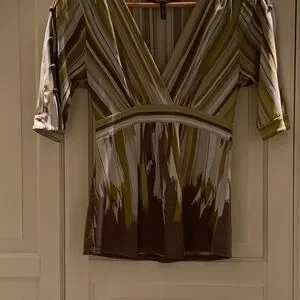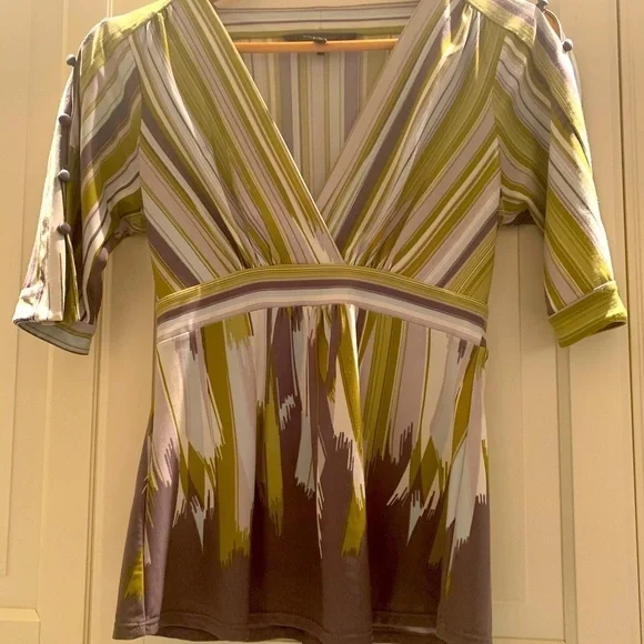Adorable BCBG top with button detailing down the sleeves Very flattering style Skirt or jeans this top was one of my favorites Great condition