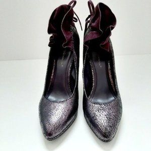 • Metallic purple glam stiletto pumps in black mosaic / crackle effect. Featuring suede ruffle at the ankle and lace up back.