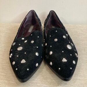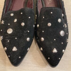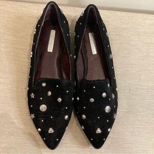 BCBGENERATION Sz 7 Nikkola Slip On Star Metal Star and Constellation Studs Suede Slip On Pointy Toe Shoes