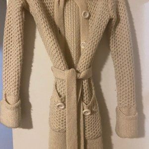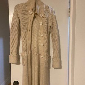 Beautiful wool long sweater. The tag that says BCBGMAXAZRIA is not on anymore. But I assure you this is authentic. For referenced I am 5"3 120lbs and this fall below my knee. I usually wear a small, in my opinion it would fit xs/small