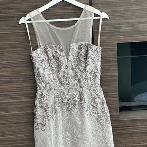 Beautiful light grey lace A-line sleeveless cocktail dress adorned with delicate lace and sequins.