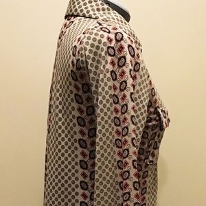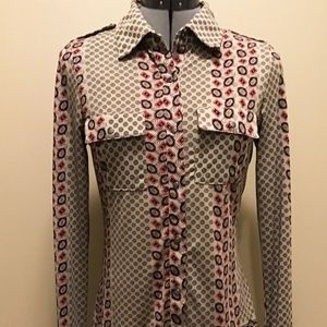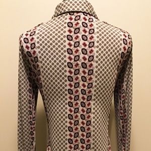 Long sleeve multi color jersey blouse with snap buttons. Size M