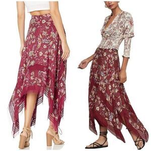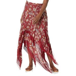 BCBGMAXAZRIA Boho Floral Print Handkerchief Asymmetrical Midi Skirt Burgundy S