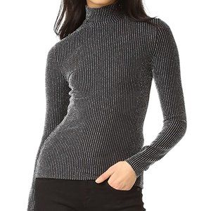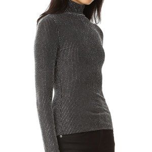 BCBGMAXAZRIA Brinne Metallic Silver Knit Turtleneck Top Blouse fitted. Stretchy and comfortable. mock-neck pullover. Long sleeves.