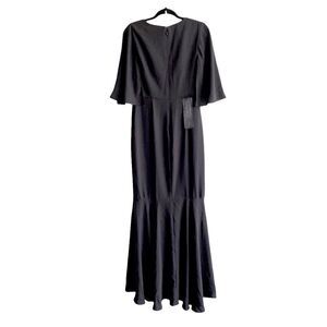 Elevate your evening glamour with this enchanting BCBGMAXAZRIA Cape Sleeve V-Neck Asymmetrical Ruffle Maxi Dress Gown. In timeless black, this gown embodies sophistication and grace with a contemporary edge.