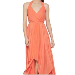 BCBGMAXAZRIA Chiffon Faux Wrap High Low Halter Dress Tie At Waist Salmon XS