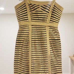 BCBGMAXAZRIA designer Beret dress. Form fitting bandage style metallic gold silk stripes over a black lining. Adjustable spaghetti straps. Zipper back.