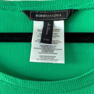 Vibrant green fitted ribbed tee dress by BCBGMAXAZRIA. Super stretchy fabric hugs the body and comfortably fits sizes XXS to XS. Made from a soft Tencel blend with a scoop neckline and short sleeves. Light signs of gentle wear, but still in great condition.