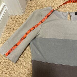 A sleek and modern colorblock midi dress in a muted pewter ombré palette. Features a flattering fitted silhouette, scoop neckline, and elbow-length sleeves, making it a perfect choice for office wear or a polished date night look. The bodycon shape hugs in all the right places while remaining comfortable with its soft stretch fabric.