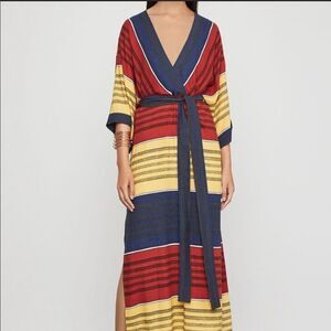 BCBGMAXAZRIA Kimono Striped Faux Wrap Casual Maxi Dress Belt Red Yellow Blue XS