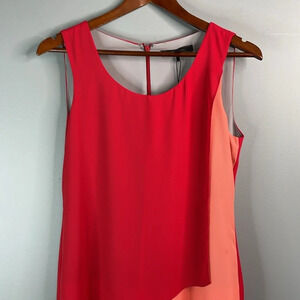 Women’s burnt poppy red, peach, coral orange and light grey BCBGMaxazria “Haley” Chiffon ColorBlock Draped Dress.