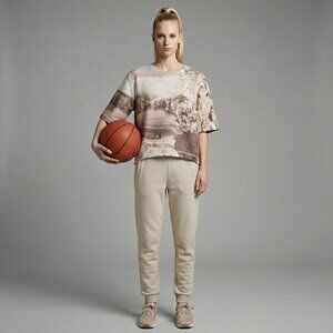 Beautiful and distinctive BCBGMAXAZRIA sweatshirt top featuring an eye-catching artistic photo print in soft neutral tones. Made from a dense, smooth fabric that feels luxurious to the touch and holds its shape beautifully. The cut is architectural and slightly oversized, with a shorter front and longer back, creating a modern, flattering silhouette. Designed with a back zipper. This piece is extremely versatile โ it can be worn over T-shirts or turtlenecks, styled for sporty looks, casual outfits, or elevated everyday wear. The charming photo print makes this top a true statement piece that draws attention without being loud.