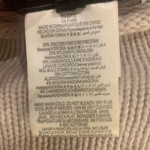 This sweater is in good used condition. The only sign of wear is pilling- I’ve provided a close up photo to show. I’ve also included a photo of the tag for the materials: 33% viscose, 23% nylon, 18% lambs wool, 18% cotton, 4% angora, and 4% cashmere.