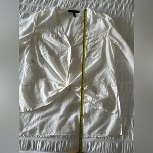 BCBGMaxazria sheer Semra blouse has long roll tab sleeves. V Neck with a button front / pullover style. Patch pockets on chest, and a unique twist design detail at the front hem. High low hem design. 70% cotton/ 30% silk blend in an off white colour. Relaxed fit. This would look great with jeans or a wide leg black pant.
