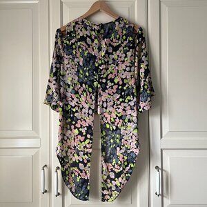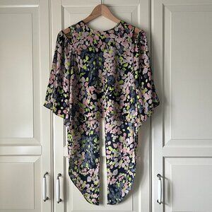 Cold shoulders define this modern top, crafted from breezy georgette fabric that features a high-low hemline, three-quarter-length bell sleeves, and a bold back slit. Worn once, in excellent condition!