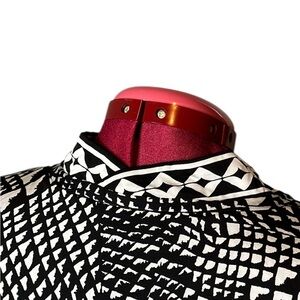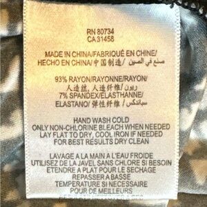 Neutral colors, all over geometric print is framed by a border print, cowl neckline, upper back is lined, soft and cool to the touch. Easy care 93% rayon, 7% spandex.