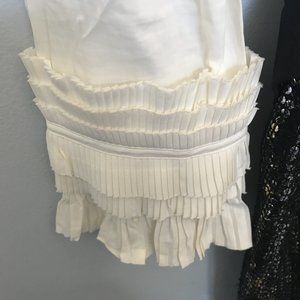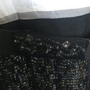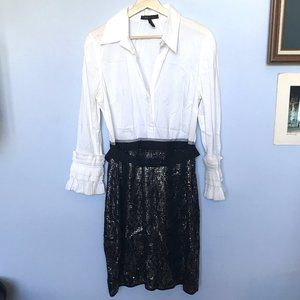 BCBGMaxAzaria dress with sequin skirt and blouse style top. Featuring unique ruffle detail at sleeves and jeweled belt encased in lace. Silk shell, satin lining, top has light stretch for perfect fit and comfort. Excellent preloved condition.