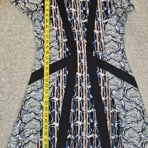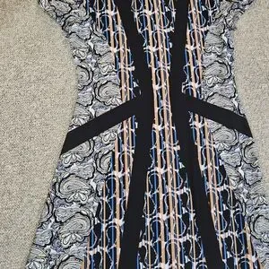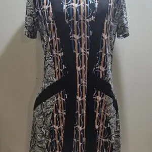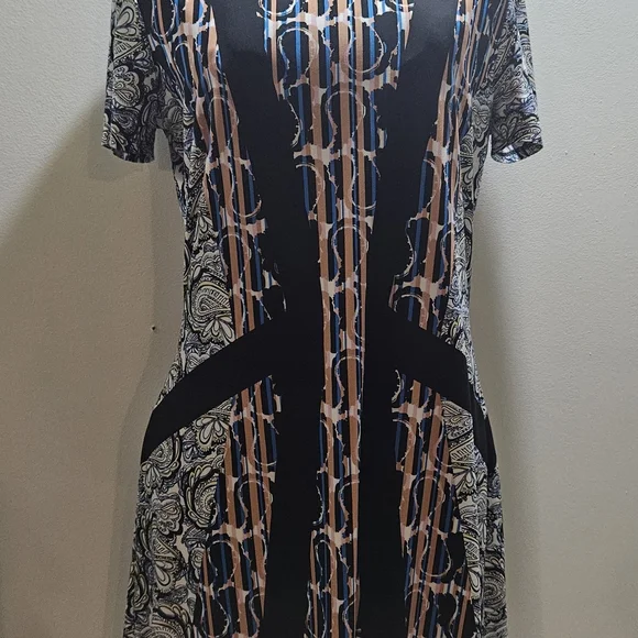 Chic dress with abstract patterns. Features black, blue, and tan hues.