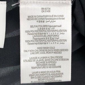 V-neckline, fully lined, hidden back zipper, stretch at bands but minimal elsewhere, machine wash/dry clean.
