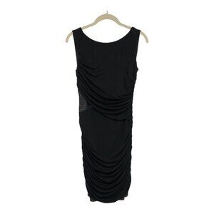 Ruched bodycon dress with beautiful drape detail. Also has nude & black lace trim on the ribs and bottom hem.