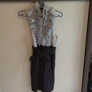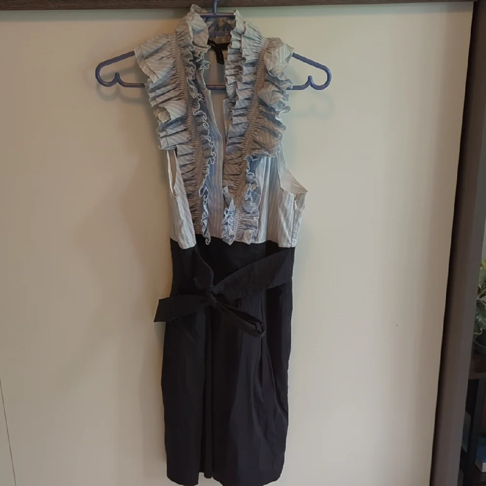 Chic dress with ruffle accents. Features blue stripes. Perfect for casual elegance.