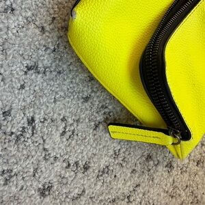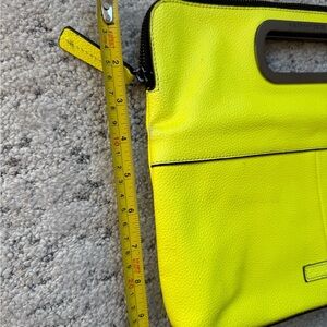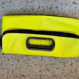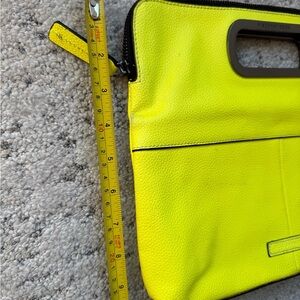 BCBG neon yellow wristlet with sleek handle. Modern and stylish accessory really great condition aside from a couple wear issues in the corners see pics