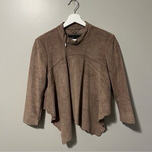 Elegant mocha faux suede jacket. Features perforated design. Asymmetrical front zip. Perfect for layering. Stretch panels under arm sleeves and back. Hidden front pockets. Excellent condition.