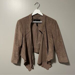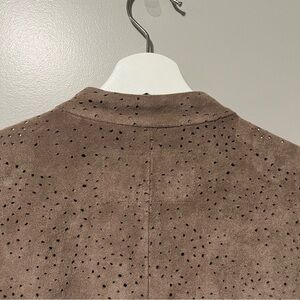 Elegant mocha faux suede jacket. Features perforated design. Asymmetrical front zip. Perfect for layering. Stretch panels under arm sleeves and back. Hidden front pockets. Excellent condition.
