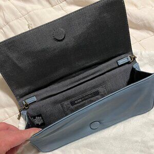 Beautiful BCBGMaxAzria leather clutch in delft blue with brass chain and studs. Has magnetic close and credit card pocket in interior. Never used, mint condition. Delivered in original flannel pouch.