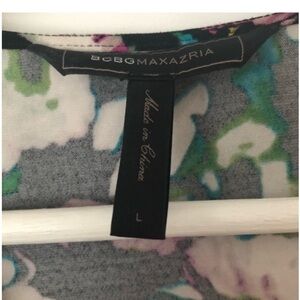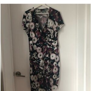 This is a lovely and easy-to-wear dress by BCBGMaxAzria. Material: 95% polyester, 5% spandex Condition: very good used condition. Features: all over floral print, v-neck, ruffles on front, faux wrap look, quite fitted From a smoke free and pet free home.