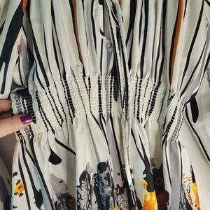 This elegant women's top features a vibrant multicolor design with striking yellow orange and black accents. Perfect for adding a pop of color to your wardrobe. Gathered ruched waist and cuffs for a flattering but comfortable fit.