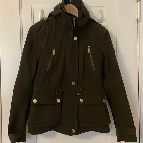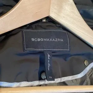 BCBG MaxAzria Jacket with removable liner. Size xs. Dark green colour. In great condition. Hood can be left out or tucked away (see last picture).