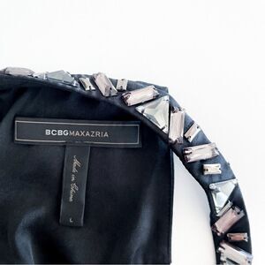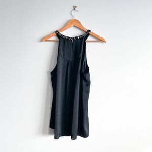 BCBGMaxAzria Jewelled Silky (Polyester) Black Tank Top Halter Keyhole Neckline Women's L Blouse. 3" Side Slits. Very good used condition. Please see photos for approximate measurements.