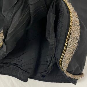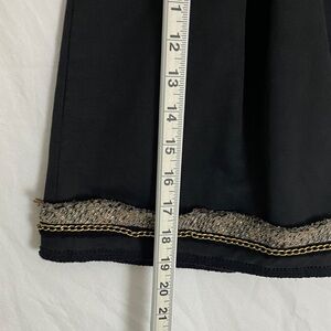 BCBG MaxAzria Kailin Mini Skirt. Women's size tag removed. Listed as size 8 based on measurements and size guide. Cotton / poly blend shell. Acetate lining. Marked as dry clean only. Black with heathered fringe at waist and hem. Chain at hem. Box pleated waist. Pocketed pockets. Side zipper.