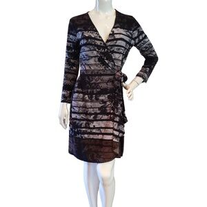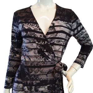 Black, grey and brown printed wrap dress with 3/4 sleeves.