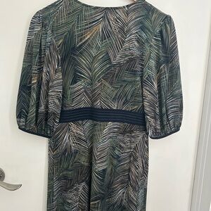 Beautiful BCBGMAXAZRIA dress featuring an abstract leaf-inspired print in deep green, taupe, and black tones. Flattering empire waist with contrast banding, V-neckline, and short sleeves. Lightweight with a soft drape — perfect for work, events, or dressed up with heels.